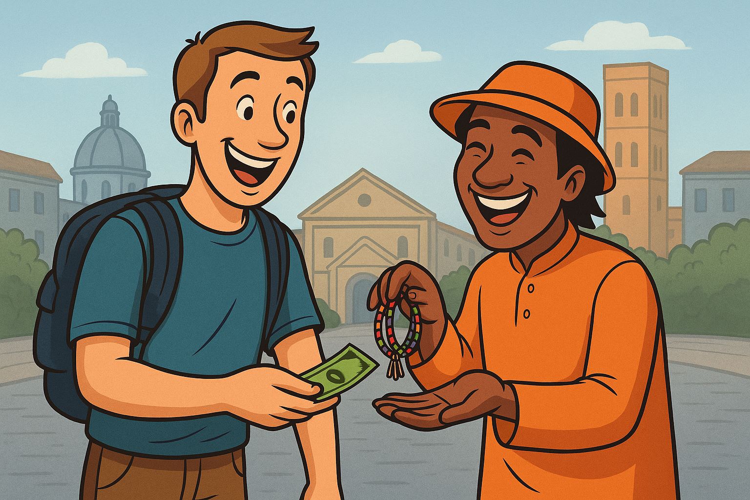 A smiling tourist hands money to a grinning stranger who just gave them a “free” bracelet, illustrating a common travel scam.