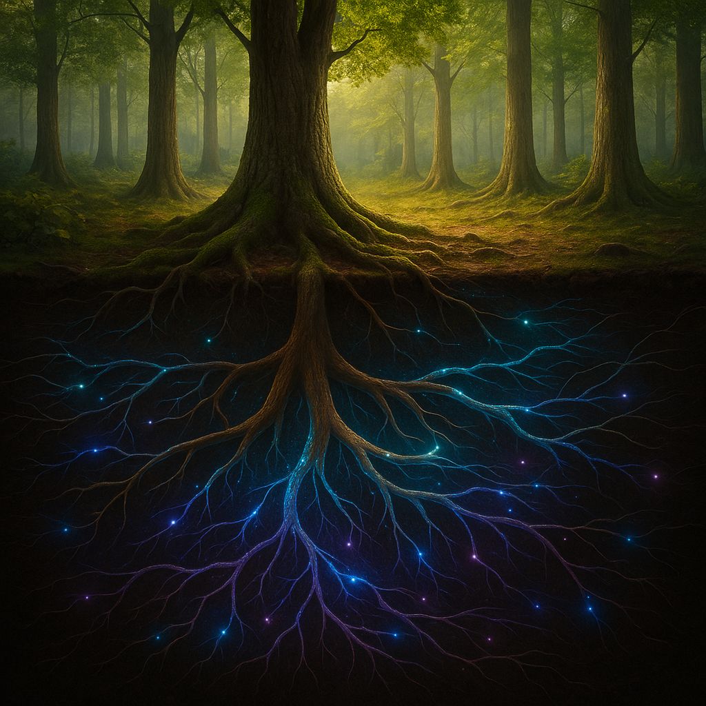 The “wood-wide web” in action—trees chatting beneath the surface via underground fungal threads.